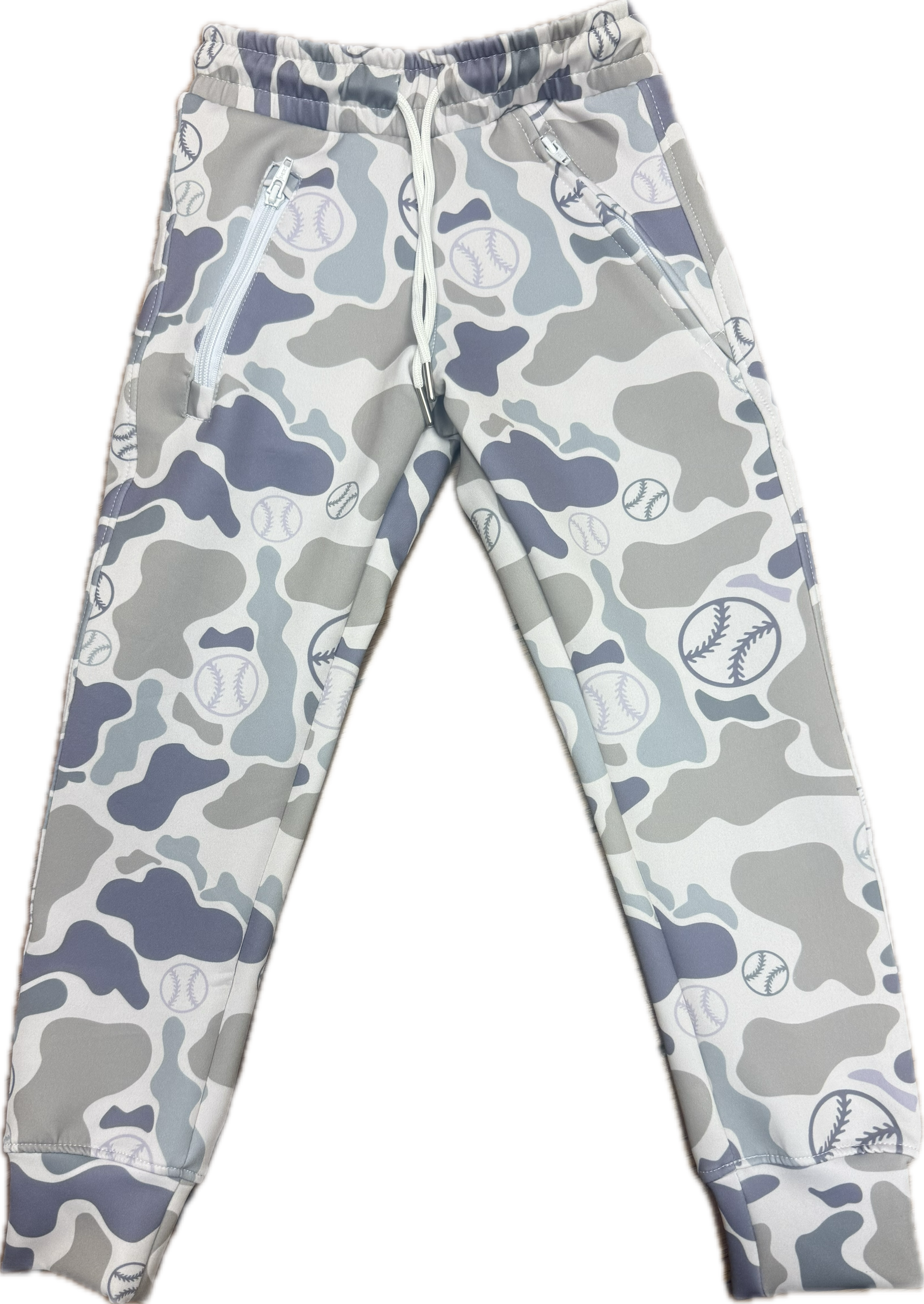 Amazing quality! Camo print with baseballs. Pockets on back and zippered pockets on front!