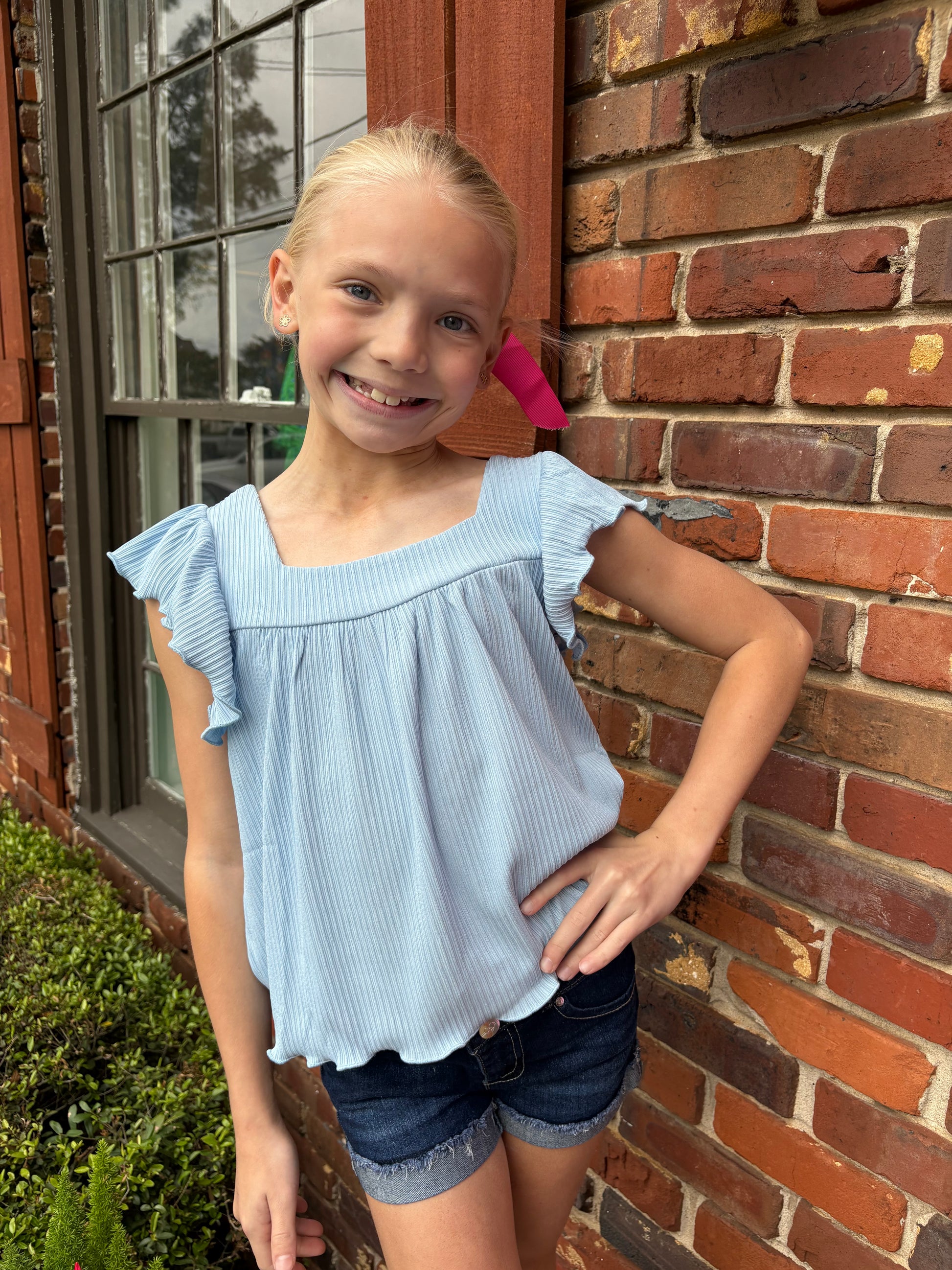 This top features a square neckline with ruffle sleeves.
