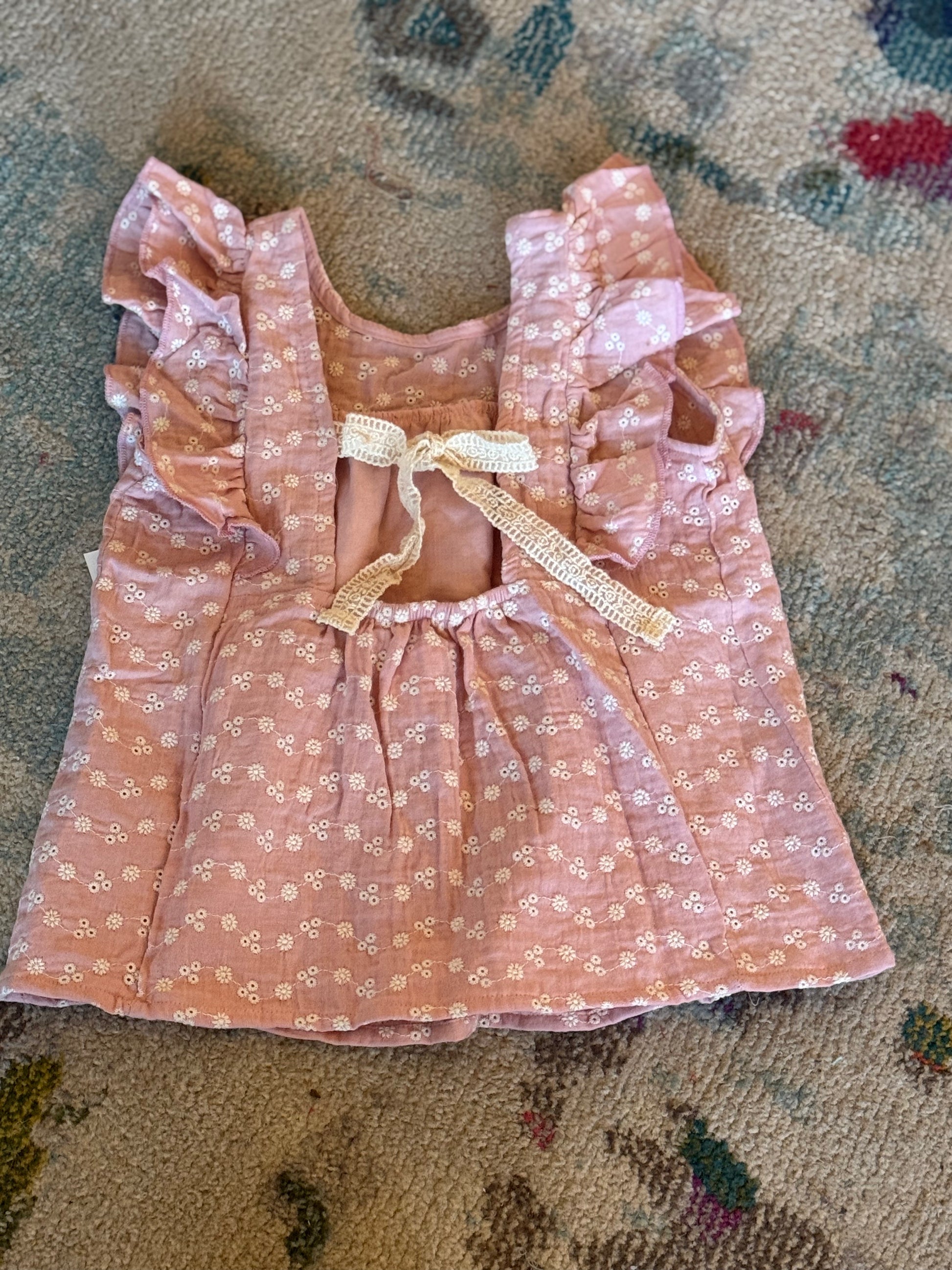 Sleeveless tunic with ruffle detail and lace tie open back in an eyelet fabric